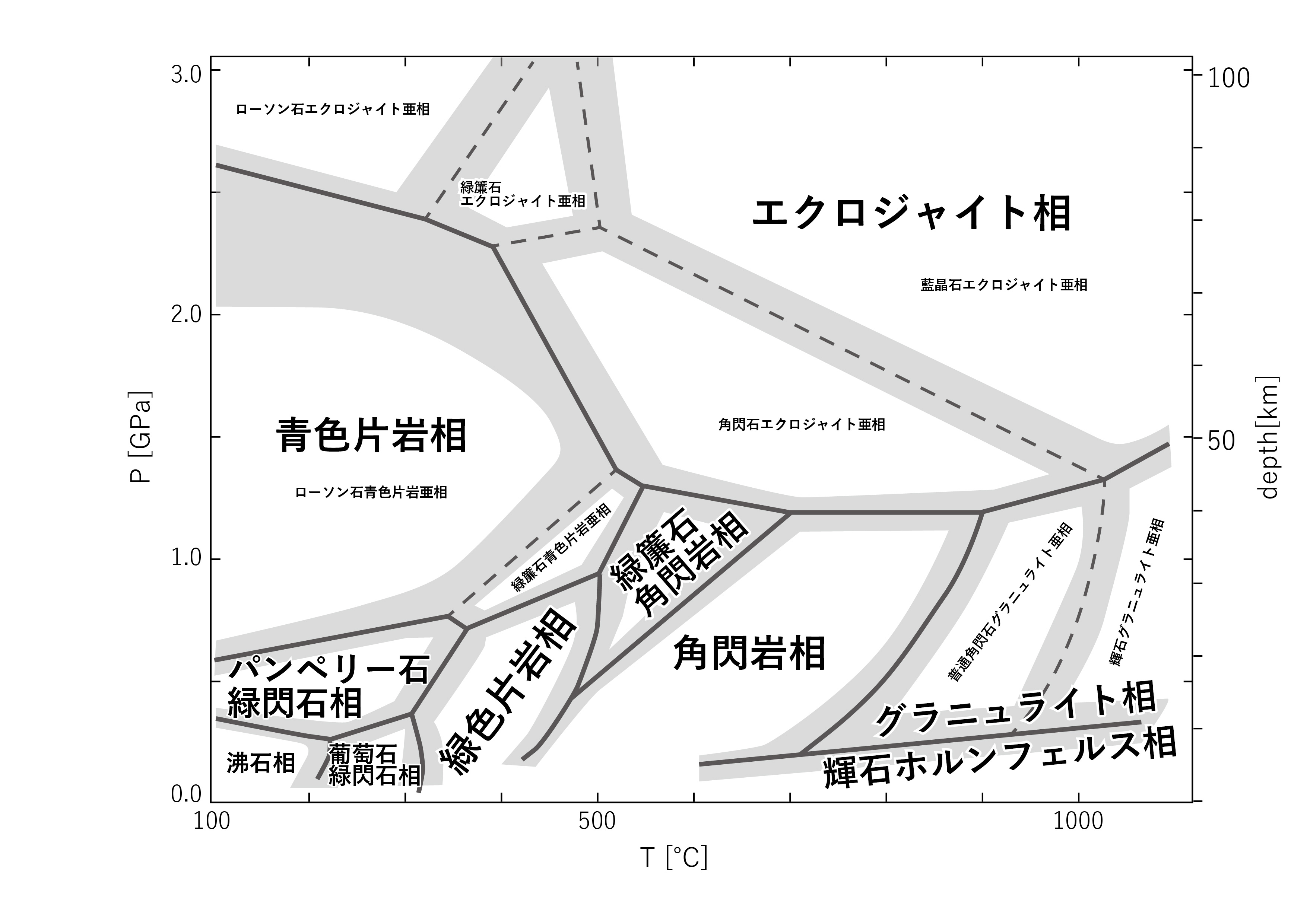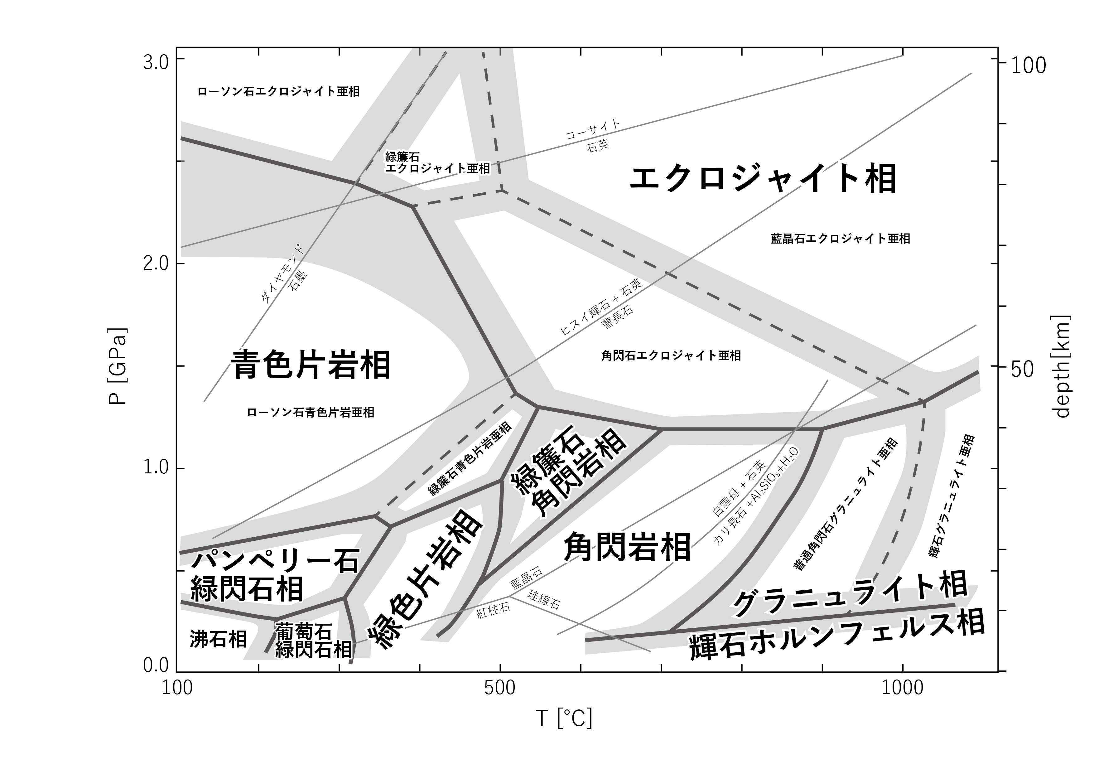 代表的な変成相図をまとめて図示しました。 シンプルな変成相図、主要な鉱物相転移境界を入れた変成相図、代表的な変成系列を入れた変成相図などのバリエーションがあります。