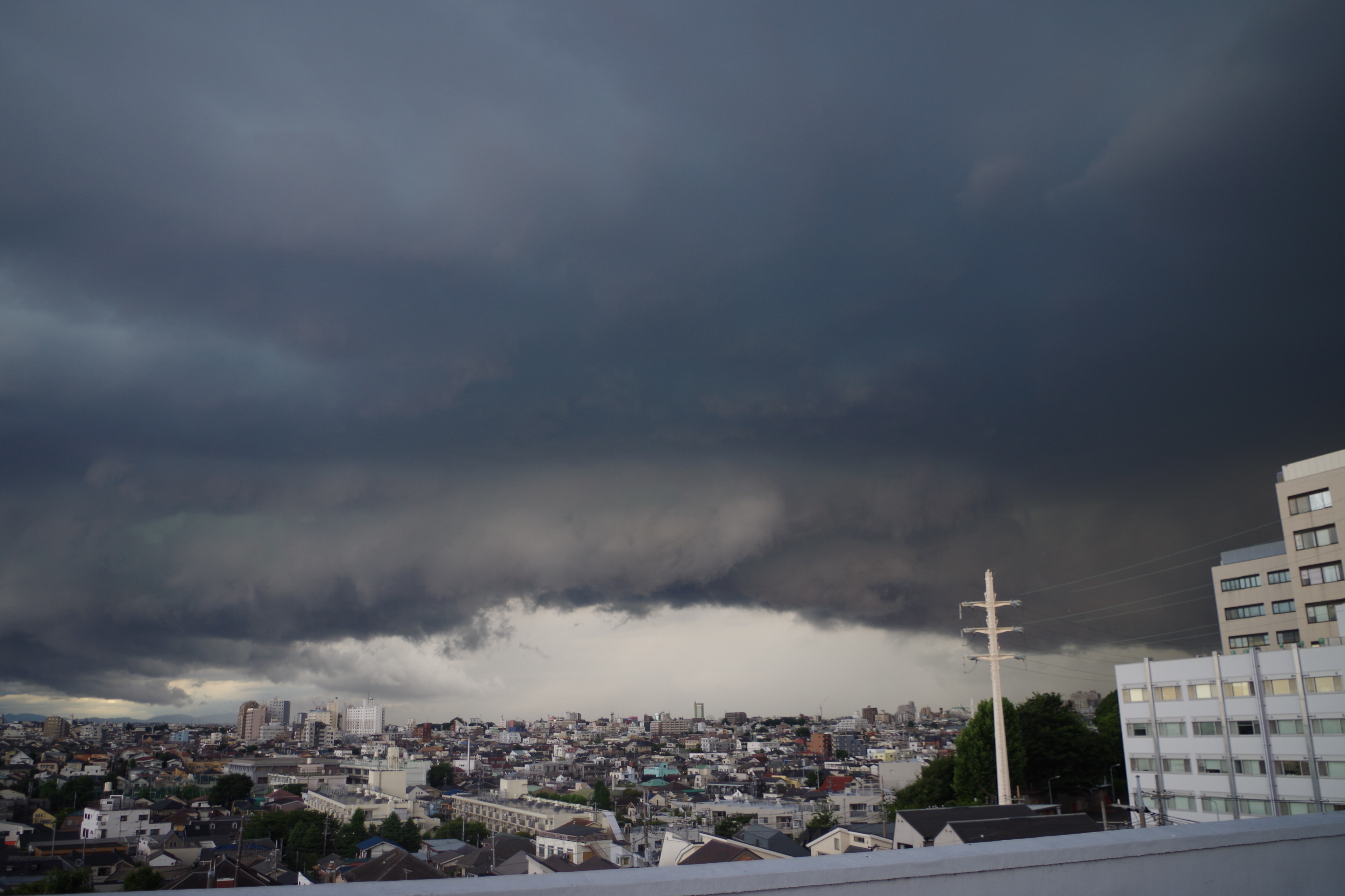 16時7分分厚い雲が近づいてきて、雷が鳴り響いていたので、屋上に出てみた。東京工業大学石川台地区の建物の屋上から観察したものになります。 まだ雨は降っていない。雷と風が段々強まってくる。上の写真は石川台より北側、東京都心方面を覗いたもの。