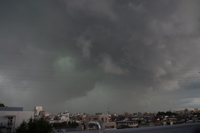 2014年6月29日、竜巻注意情報が発令されていた東京都太田区において自分でも緑色の雲が確認することができ、