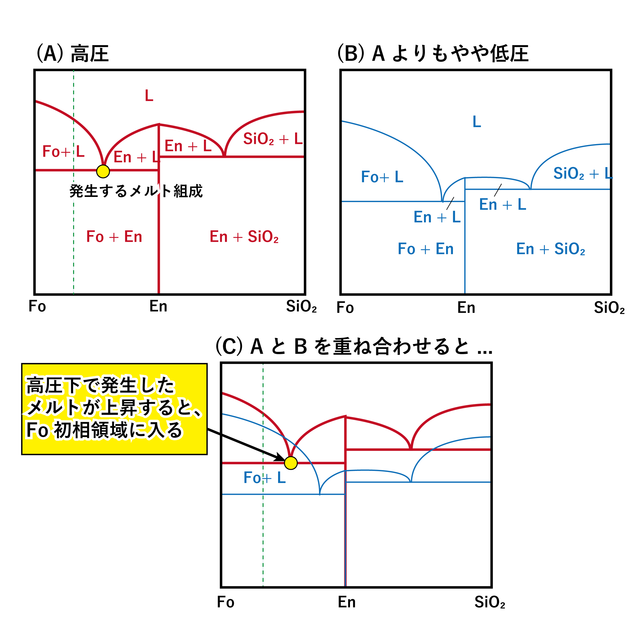 Fo-En-SiO2系の相図を用いたダナイトの成因の模式的な説明