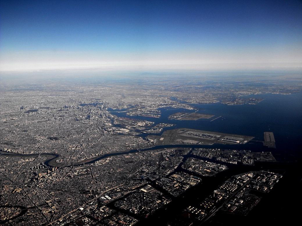 一番手前は川崎市、京浜運河とそこに並ぶ工業地帯がよく見えます.
