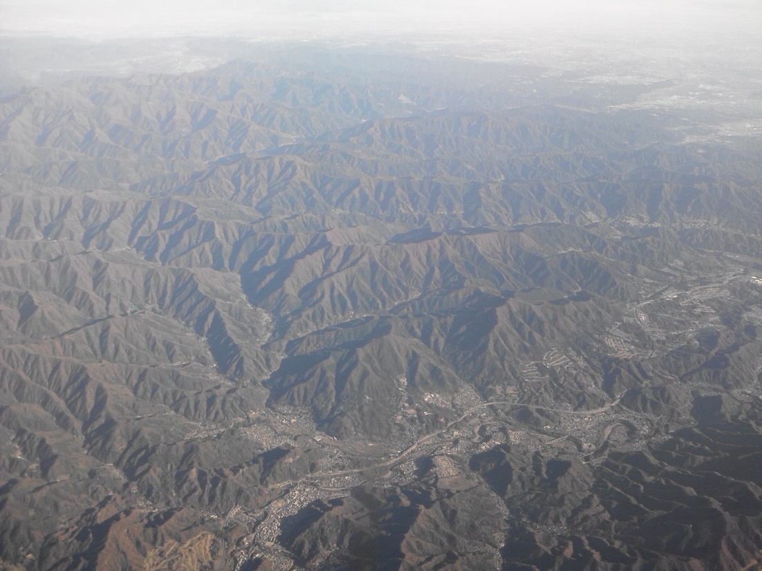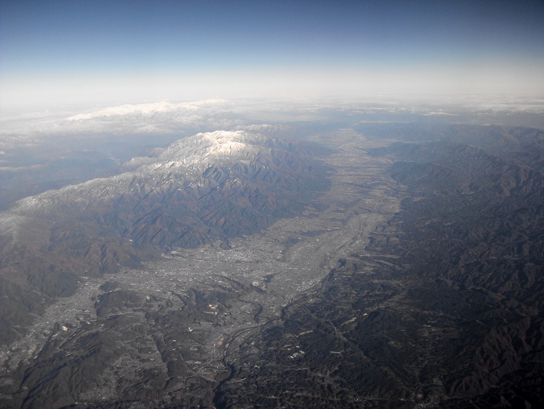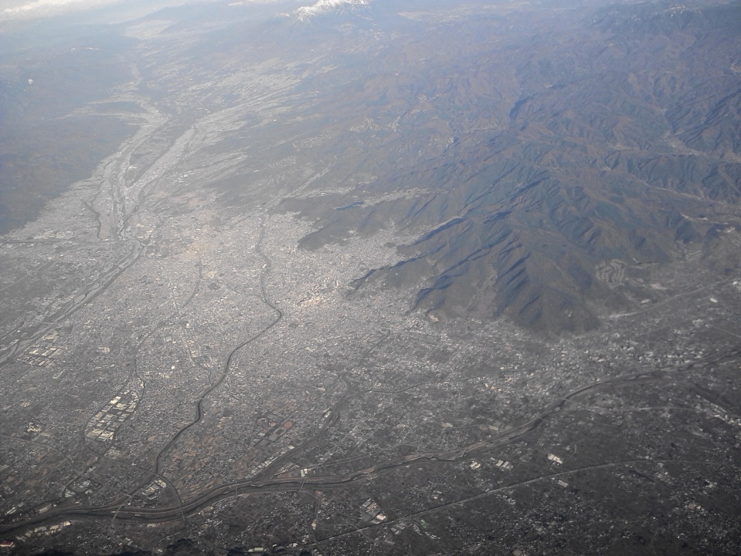 教科書では必ず出される日本の扇状地の模式地のようなばしょであるが、これを飛行機で上空から見るのは初めてであり、大変感動した!